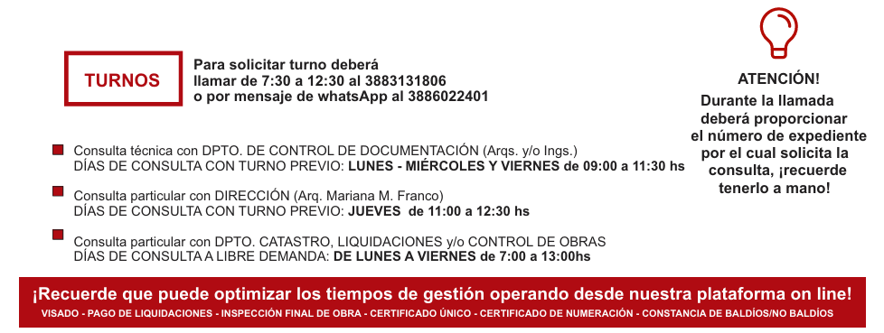 Si el inmueble a tramitar se encuentra en el Barrio Alto Comedero, deberá gestionar el trámite que corresponda en la Delegación de Alto Comedero (0388-4056933)