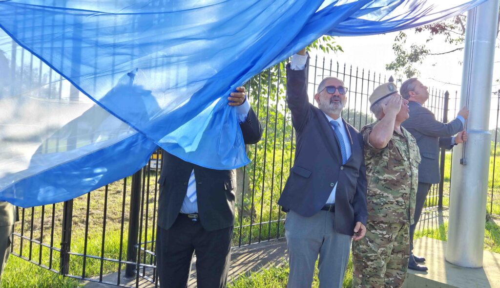 El intendente Raúl “Chuli” Jorge presidió, junto al titular del Concejo Deliberante, Gastón Millón, el acto de reposición e izamiento de las enseñas Nacional y de la Libertad Civil en los mástiles del Parque Cívico, ubicado en el acceso sur de la ciudad.