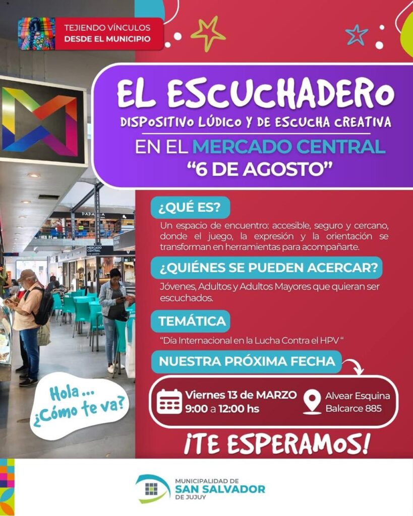 La Municipalidad de San Salvador de Jujuy invita a la comunidad a participar de una nueva jornada de “El Escuchadero”, un dispositivo lúdico y de escucha creativa que promueve espacios de encuentro, orientación y acompañamiento para la comunidad.
