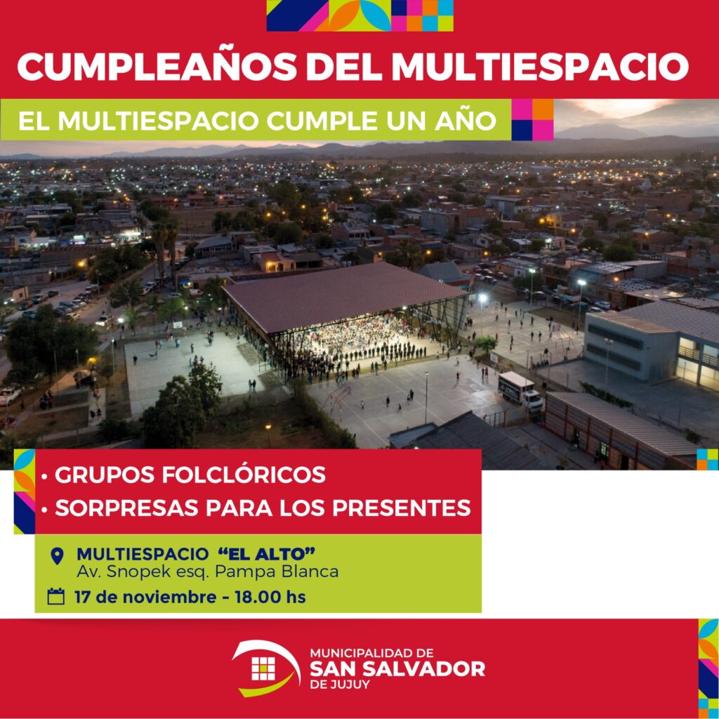 La Municipalidad de San Salvador de Jujuy invita a todos los vecinos y vecinas, este viernes 17 de noviembre, a las 18 horas, al Multiespacio El Alto, que se vestirá de gala para celebrar su primer aniversario con una jornada llena de música, folclore y sorpresas para toda la comunidad.
