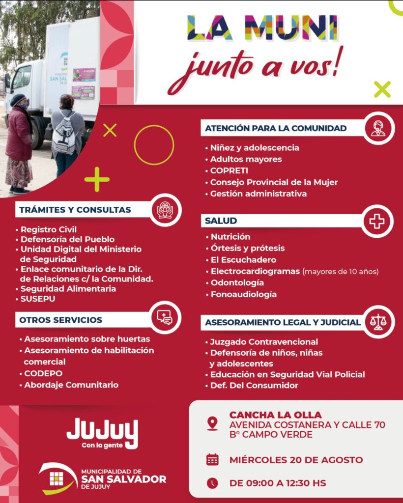 En el marco del programa “La Muni Junto a Vos”, la Municipalidad de San Salvador de Jujuy realizará una jornada de servicios integrales para los vecinos del barrio Campo Verde. La actividad tendrá lugar el miércoles 20 de agosto, de 9:00 a 12:30 hs, en la cancha La Olla (Avenida Costanera y Calle 70).