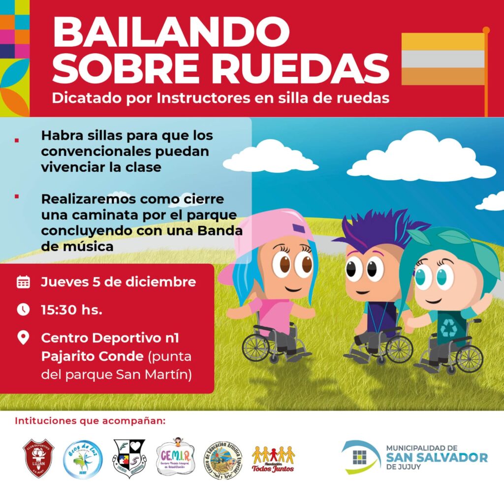 En el Centro Deportivo N°1  del Parque San Martín,  la Municipalidad de Salvador de Jujuy realizará el jueves 5  a partir de las 15.30 horas, la primera edición del “Bailando sobre ruedas”, para personas con discapacidad; el evento contará con la participación de delegaciones de distintas instituciones del medio y permitirá a las personas presentes, vivenciar y experimentar actividad rítmica sobre sillas de ruedas.
