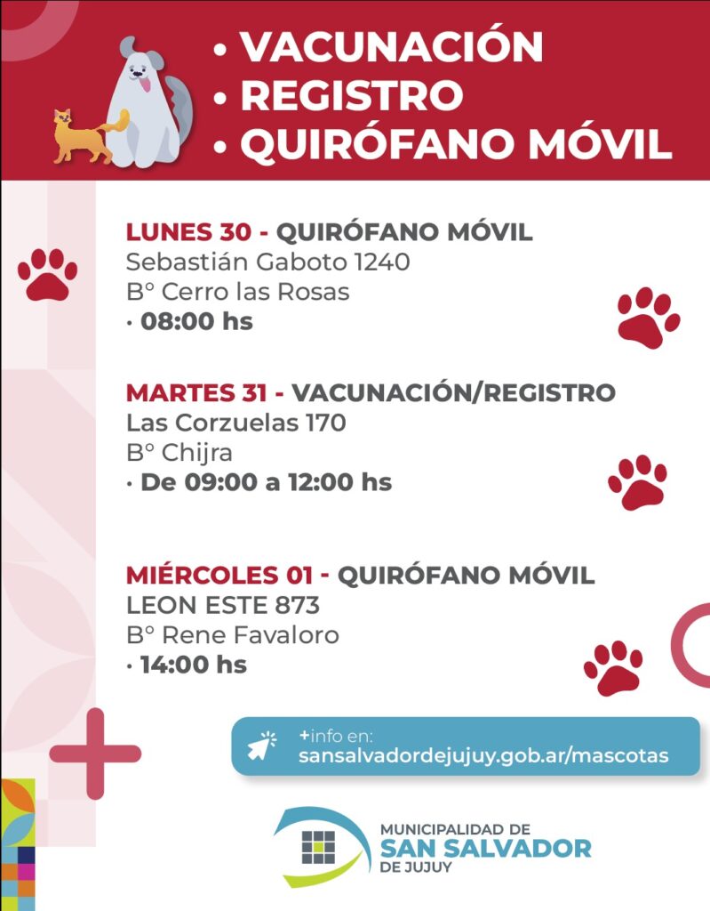 La Dirección de Zoonosis de la Municipalidad de San Salvador de Jujuy, informa a todos los interesados el cronograma y la ubicación del Quirófano Móvil y los operativos de vacunación y registro de mascotas que tendrán lugar durante la semana en diferentes sectores de la ciudad.