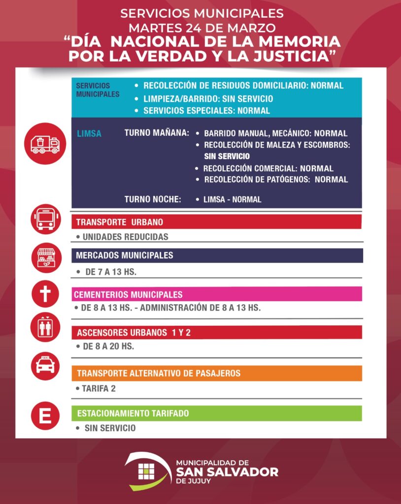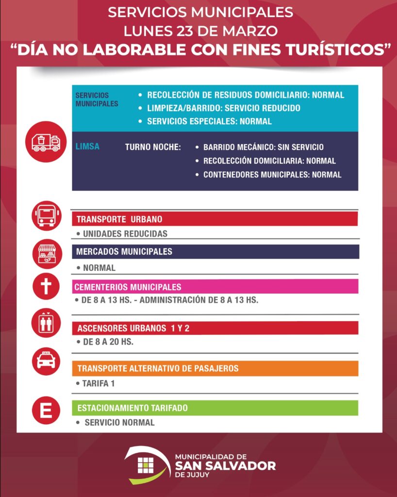 La Municipalidad de San Salvador de Jujuy dio a conocer cómo será la prestación de servicios durante el lunes 23, día no laborable con fines turísticos y el martes 24 de marzo, feriado nacional por el Día de la Memoria por la Verdad y la Justicia.0