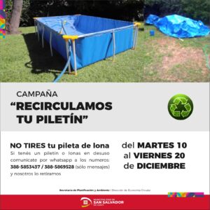 La Municipalidad de San Salvador de Jujuy invita hasta el 20 de diciembre a acercar piletines y lonas en desuso. Las mismas podrán ser retiradas del domicilio por personal municipal