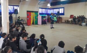 Los divertidos personajes, el Payaso París y Florcita, de la Dirección de Tránsito y Transporte dependiente de la Secretaría de Servicios Públicos de la Municipalidad de la Capital, junto a