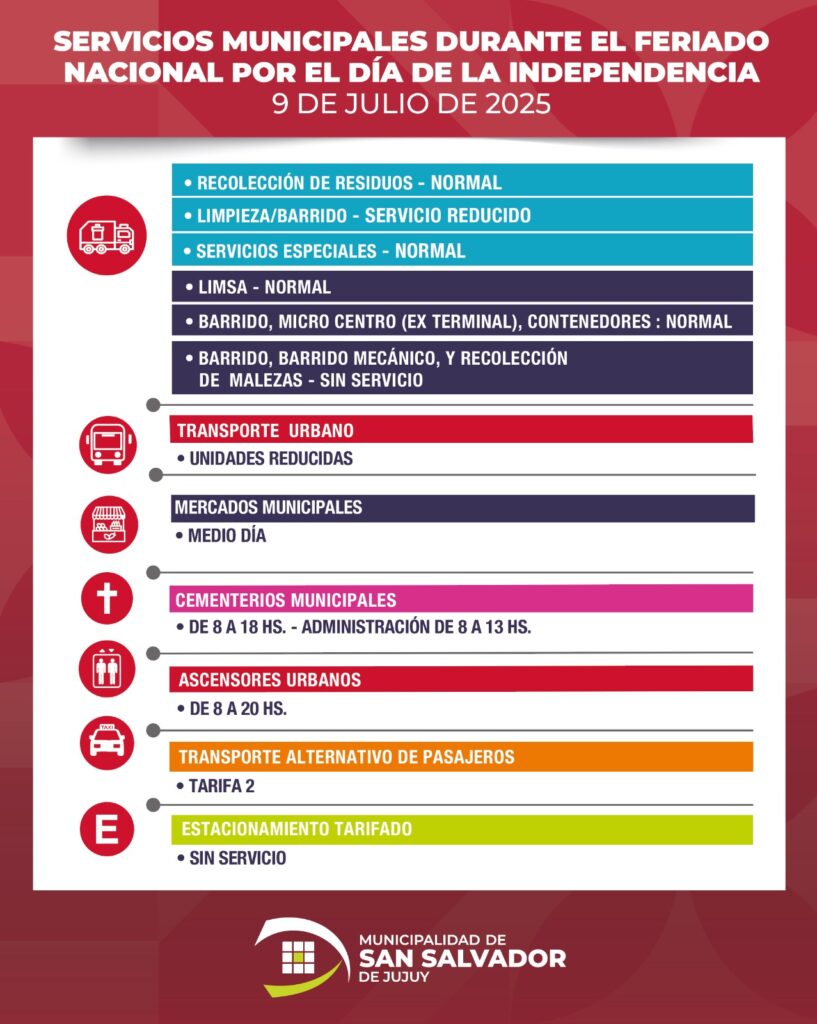La Municipalidad de San Salvador de Jujuy informó la modalidad de prestación de servicios municipales el día miércoles 9 de julio por conmemorarse el Día de la Independencia.