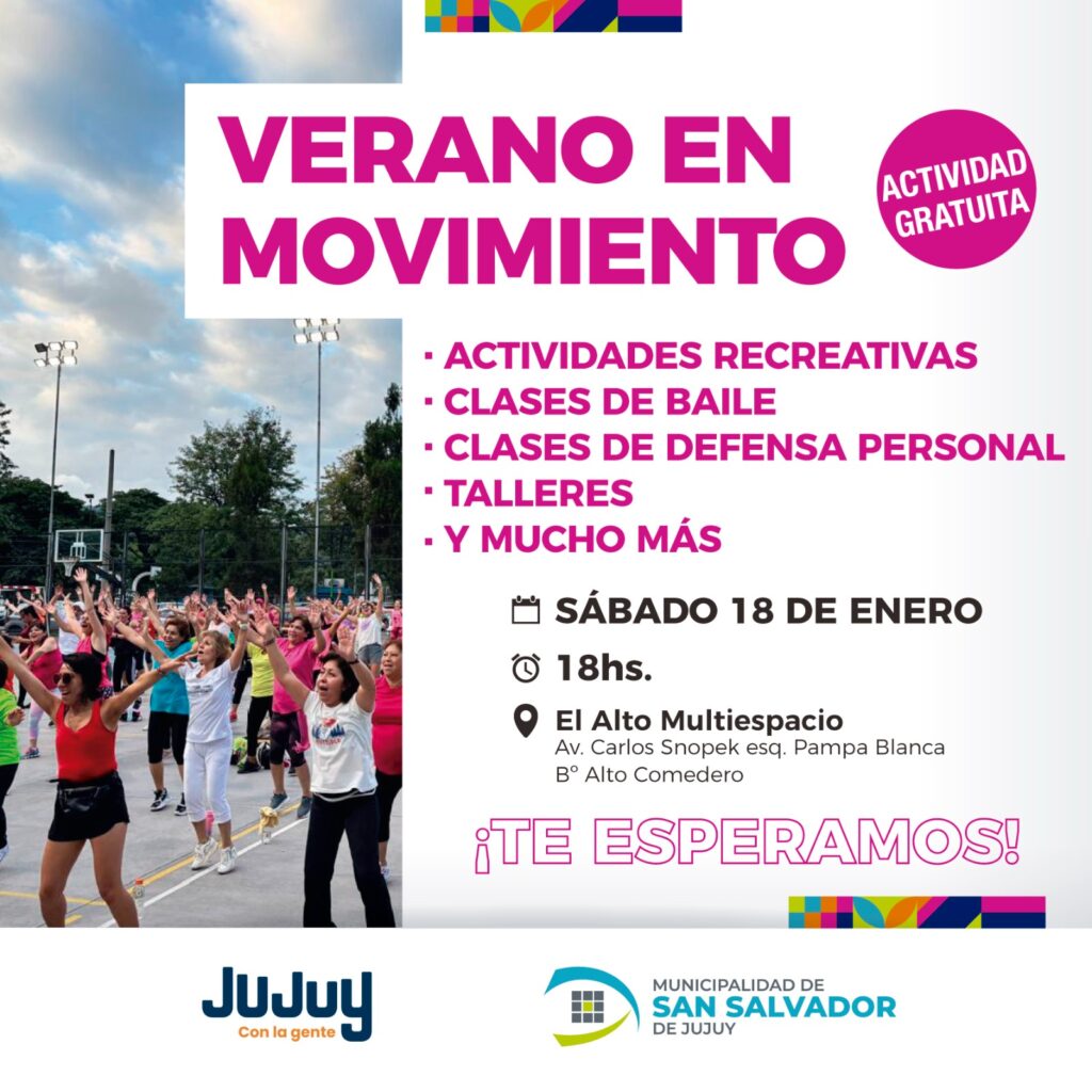 La Municipalidad de San Salvador de Jujuy invita a la comunidad a participar del evento gratuito “Verano en Movimiento”, una jornada repleta de actividades recreativas y deportivas diseñada para disfrutar al aire libre. El evento se llevará a cabo el sábado 18 de enero a las 18 horas en El Alto Multiespacio, ubicado en la avenida Carlos Snopek esquina Pampa Blanca, en el barrio Alto Comedero.